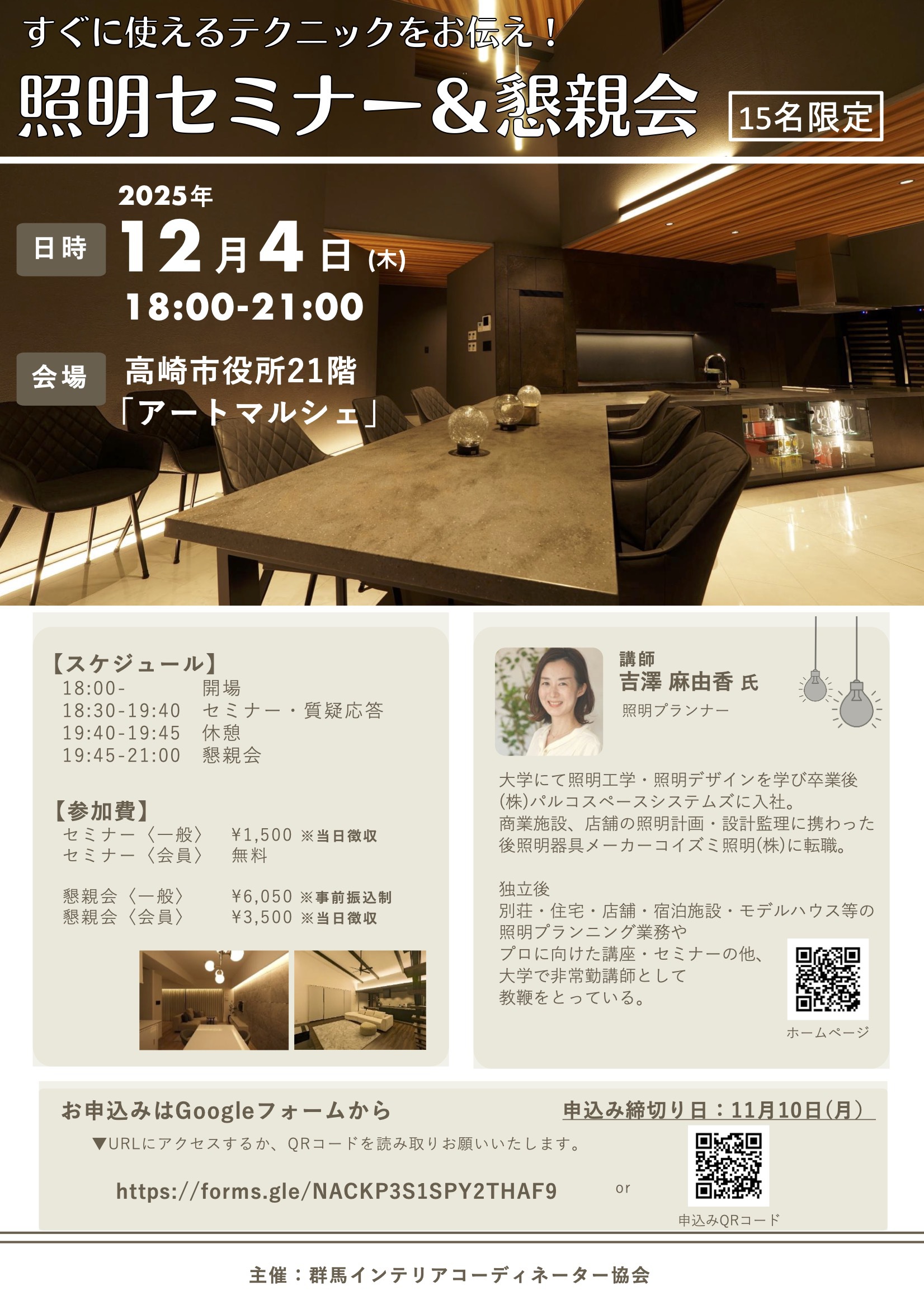 【内 容】セミナー 18:30~19:40 すぐに使えるテクニックをお伝え!照明セミナー